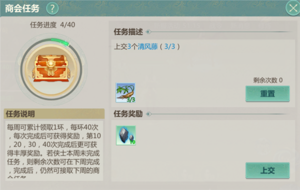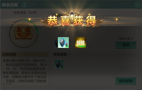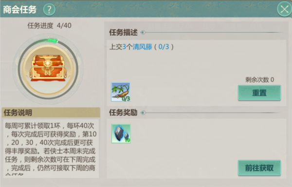此任务为环任务,每环包含40个小任务;本周接取的任务若未完成,可延续至下周继续,完成后才可接取新一周的商会任务;任务一旦接取不可放弃。