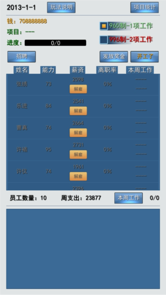 注意:开工前需选择工时制度,选项包括965单任务制与996双任务制;后者虽能提升产出,但容易引发员工不满甚至离职。