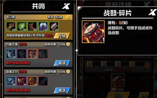 集齐多件装备可激活共鸣,提升被动属性,共鸣等级随装备培养而提高。