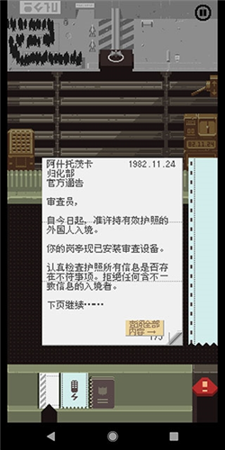《请出示证件》安卓2025版是一款从Steam平台移植的像素风格模拟游戏。本作完整保留了电脑端的核心玩法,同时针对移动设备的操作习惯进行了适配优化,确保玩家在手机上也能获得流畅的体验。游戏背景设定于虚构的冷战时期,你将扮演一名边境检查站的官员,每日面对形形色色的入境者,审核他们递交的各类文件,并依据不断更新的法规做出是否准许通行的决定。
