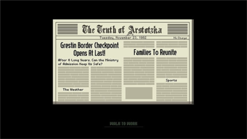 故事发生于一个名为Arstotzka的虚构国家,该国在与邻国Kolechia长达六年的战争结束后,收回了边境城市格莱斯丁的部分区域。国内局势紧张,政府实行高压管控。主角因劳动获奖而被任命为东格莱斯丁边境检查站的检察官,自此开始日复一日的审查工作。这份工作收入微薄且与审核效率挂钩,玩家必须谨慎处理每一份申请,因为任何失误都可能危及自身与家人的生存。