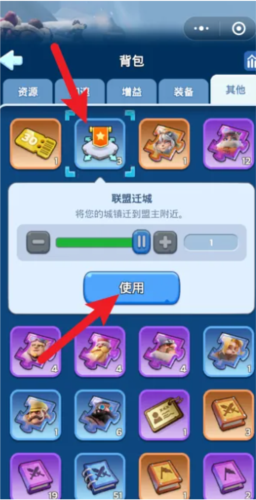 进入背包页面,使用联盟迁城道具。