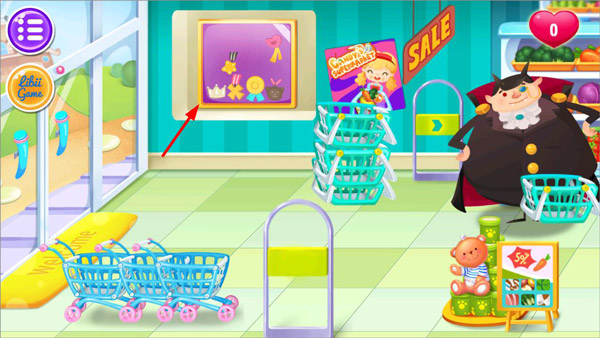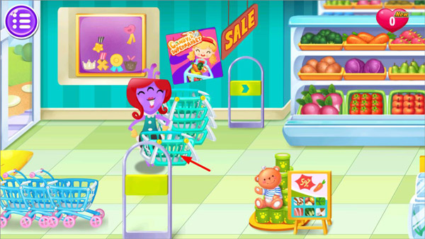 1、打开游戏,欢迎光临糖糖超市,看看来的顾客,先递给他们购物工具,然后就可以开始陪同逛街了;