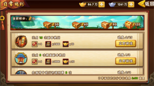 优先处理界面上的红点提示;完成日常任务可获得积分,积分累积到指定数值能开启每日宝箱,箱内元宝与体力丹务必领取。日常任务难度普遍不高,应尽早完成。