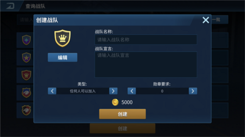 在战队界面点击创建按钮,会弹出创建窗口,创建需消耗5000金币。