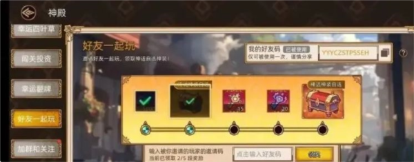 ③开服必做任务等级达到13或14级左右,活动会开放“好友一起玩”栏目,填写五位好友的邀请码可领取红色品质装备自选箱。注意每人每天仅能填写20次,且每个邀请码只能被使用一次。