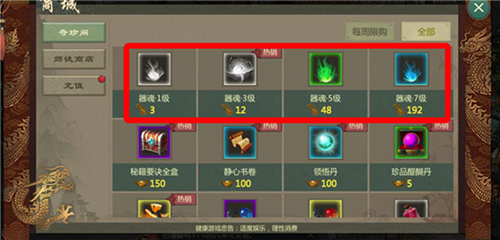5、装备器魂:在商店使用银票购买,镶嵌后可为角色增加潜能点。