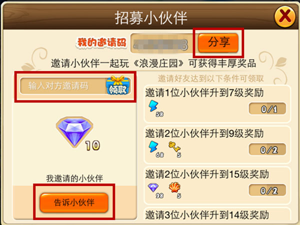 3、将你的邀请码分享给好友,请对方填写;你也可以填写好友的邀请码,协助对方完成任务。成功邀请后,新玩家可获得10钻石奖励。