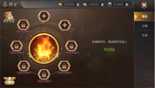 1、通过符文闯关可解锁对应的符文镶嵌槽位;