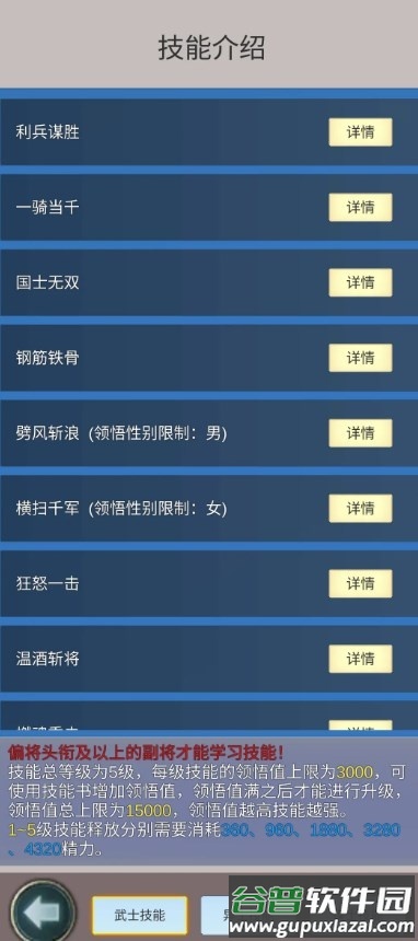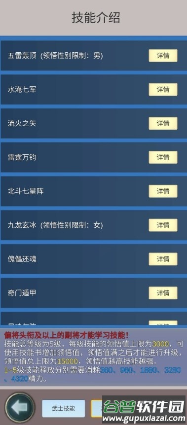 点击详情按钮能查阅技能不同等级的效果。偏将及以上品质的副将可在主城的神技界面学习特殊技能,学习需要消耗神技领悟书,该道具可在商场购买。副将10级可学习第一个神技,50级可学习第二个。请注意,副将重新学习神技会清空当前已积累的领悟值。