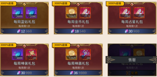 每月蓝钻豪礼(三十元等于一百六十抽,性价比略高)与每月占星礼包(三十六元等于一百八十抽,性价比稍低);神器豪礼仅建议投入较大的玩家考虑,可快速提升角色伤害。