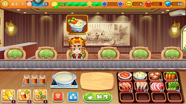 5、能够体验四十余种特色火锅的制作过程;准确选择锅底与配菜,并快速操作是取胜关键。
