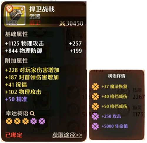 金色装备有概率附带树语属性,树语可随机提升不同属性并增加战力评分;树语等级为2至5级,数量越多属性增幅越大。树语的出现概率、数量及属性均为随机,可被继承至新装备。