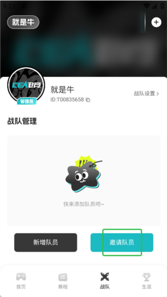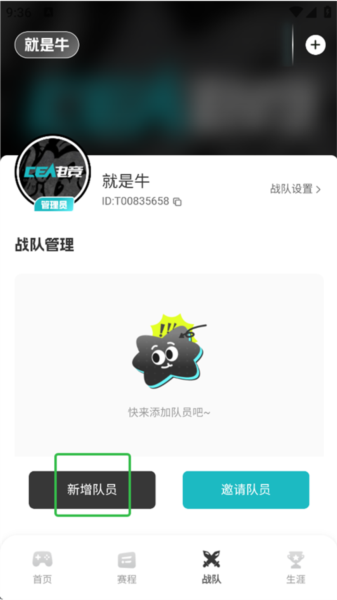 4、战队成功创建后,即可添加队员,点击页面上的【新增队员】。