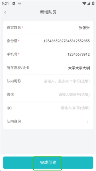 5、输入队员的姓名与身份证号码等信息,点击【完成创建】保存。