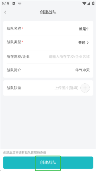 3、填写战队名称并选择战队类型,随后点击【创建战队】。