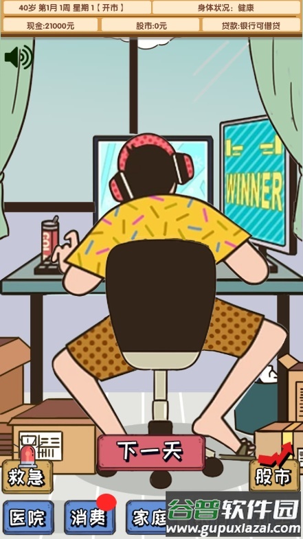 1. 游戏中,你是一名待业在家的人,需要学习股票交易技巧,研究市场行情,并进行投资操作;