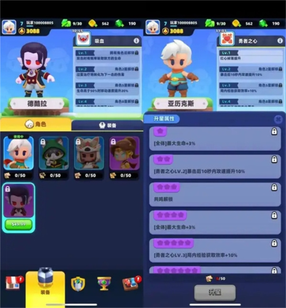 保留角色、装备、天赋三大系统。角色拥有独特能力,可通过升星解锁;装备栏位共六个,品质由颜色区分,可用三件相同装备合成更高品质。高品质装备提供更强基础属性及额外特效。