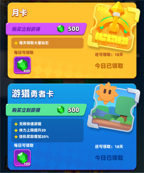 3.月卡:永久补给卡的限时版本,每日领取400钻石,需每月续费。