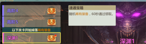 从中阶开始,玩家需在3分钟内通关,超时即失败。若在1分钟内击败BOSS,则可开启额外宝箱,获得对应层数难度的装备奖励。