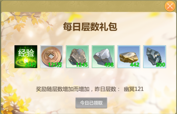 每日可根据当前挑战层数,领取相应额度的经验、铜钱及强化材料。
