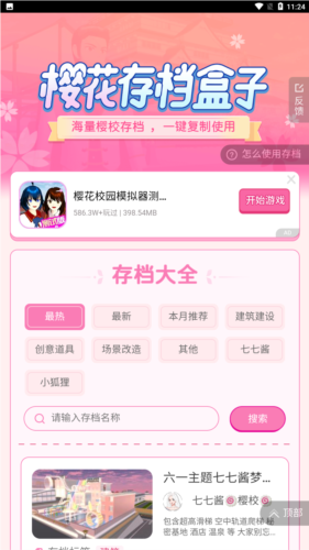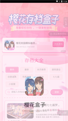 樱花盒子app是acme Studio推出的一款游戏辅助工具,主要服务于樱花校园模拟器手游用户。该软件为玩家提供了丰富的便利功能,其中包含大量由资深玩家分享的存档资源,用户可以通过共享的存档ID直接获取。软件体积小巧,界面设计清晰,操作流程简单,方便玩家快速下载并体验游戏的最新版本。在游戏中,玩家将扮演一名二次元风格的美少女角色,在樱花镇中自由探索,与各类NPC进行交流互动,同时体验多种生活场景与冒险环节。