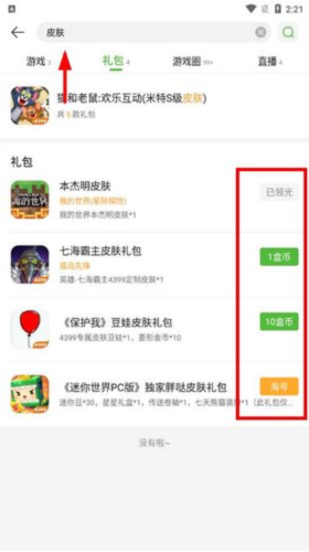 3、或者在【礼包】页面使用盒币购买皮肤,也能通过淘号、抢号等方式免费获取;礼包数量有限,需要及时领取。