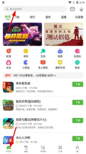 1、在手机上启动应用,主界面包含新游、单机、生存、冒险、网游、在线玩等分类。