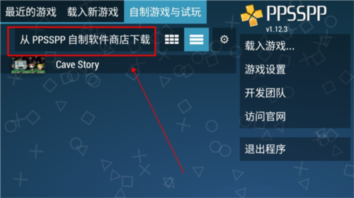 1、下载并打开手机PSP模拟器最新版本,点击自制游戏与试玩入口;