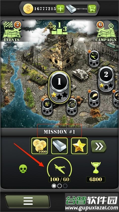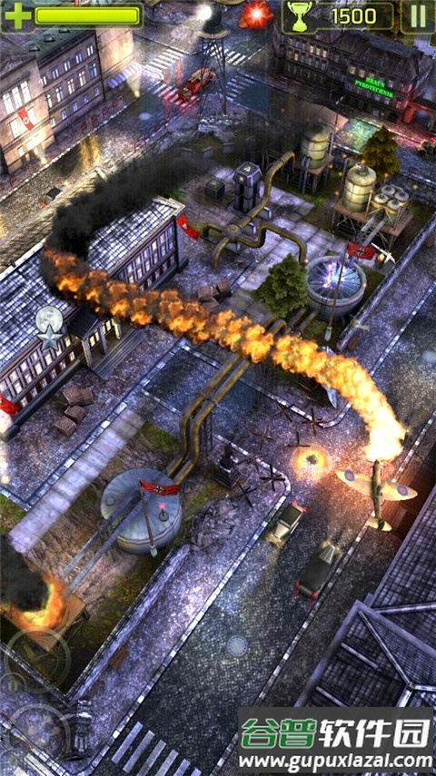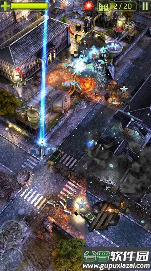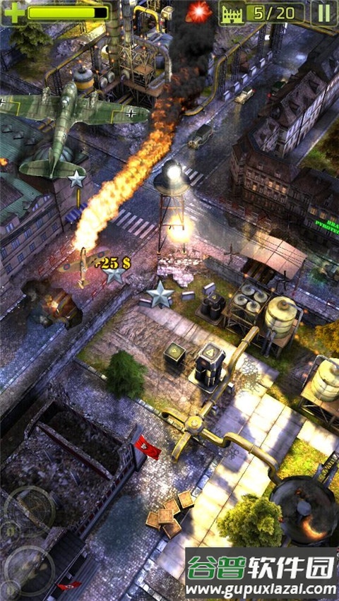 6、双击屏幕可投掷导弹,飞行过程中可同时使用机枪与炸弹,对敌方建筑与地面单位造成范围破坏。