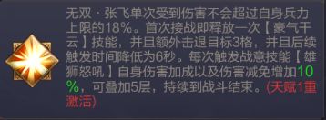 大幅提升无双张飞的承伤与控制能力。单次所受伤害不超过最大兵力的18%;每次释放大招可叠加自身伤害减免,持续至战斗结束。首次接敌时触发“豪气干云”,并将其冷却缩短至6秒,使控制更加频繁。