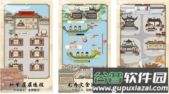 2、科举晋身,踏入朝堂,参与盛会;门生不仅可攻读诗书,通过科举考取功名,进入朝堂谋取权位,还能代表书院参与激烈的龙舟文会竞赛,体验多元的书院日常。