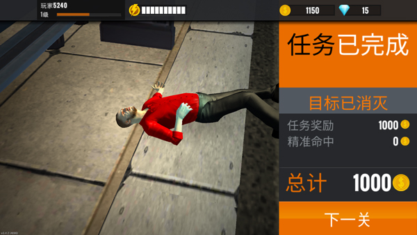 使用倍镜调整角度,迅速击毙目标完成关卡;后续关卡难度将逐步提升。