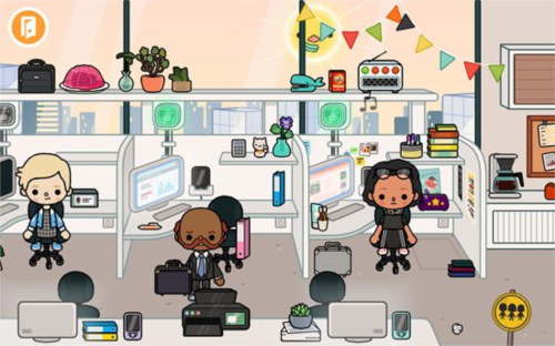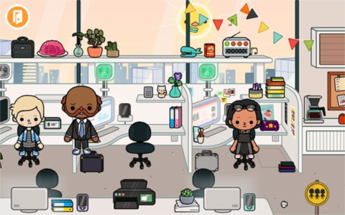 2、点击任意建筑即可进入,例如选择商业楼,内部呈现办公室场景,可见多种办公用品与工作人员。