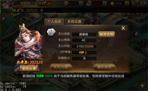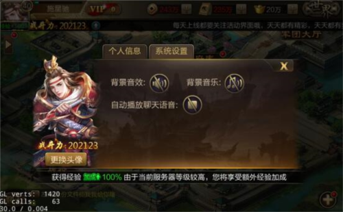 游戏主界面左上角显示角色名、等级、经验条及VIP信息,点击头像可进入设置界面,进行头像更换、礼包兑换或音效开关等操作。