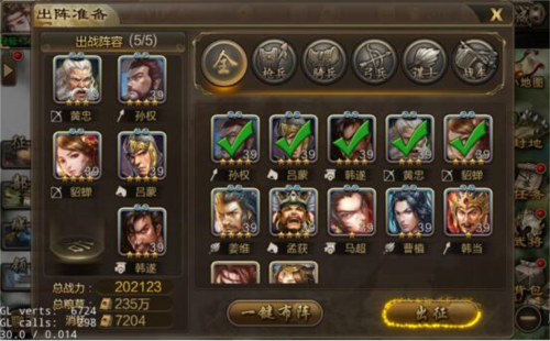 每场战斗前需部署阵容,从右侧列表点击武将头像即可派遣上阵,最多可上阵五名武将,参与国战则必须满编。布阵完成后点击出征进入战场。