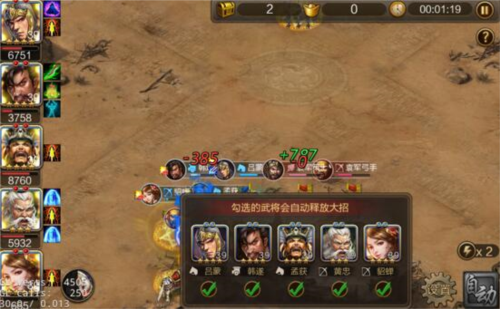 点击右下角自动按钮开启自动战斗模式,武将将自动寻敌并释放技能;上方的加速按钮可切换为二倍战斗速度;设置按钮则用于勾选自动战斗中允许释放大招的武将,实现更精细的自动战斗管理。