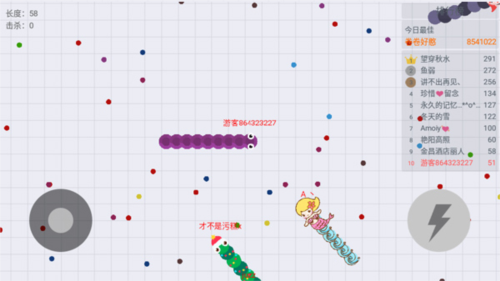 1、使用摇杆操控你的小蛇移动,吃掉地图上的彩色圆点可以使其身体变长。