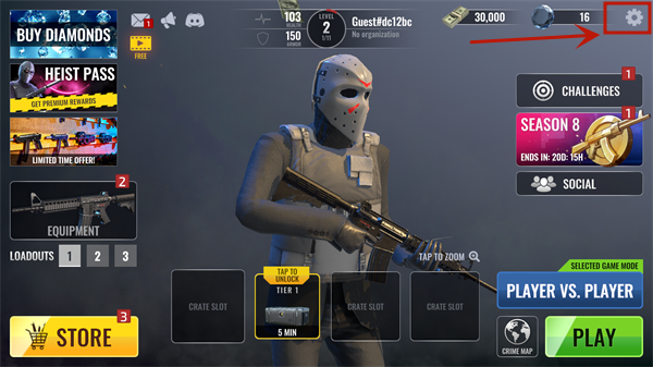 1、进入游戏后界面默认为英文,点击右上角齿轮图标进入设置。