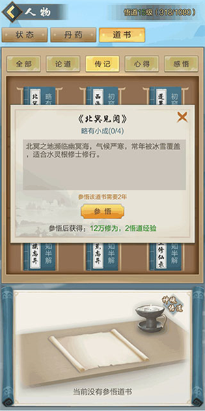 9、通过传功快速抵达合体期,开启悟道系统。悟道5级前全部阅读传记,以快速提升悟道等级,增加悟性。5级后开始研读心得,获取大量经验。合体期后神游奇遇中会出现悟道书,遇到必买;建议购买神魂悟道以持续进行;每本书首次读至融会贯通有额外奖励,避免重复阅读同一本。