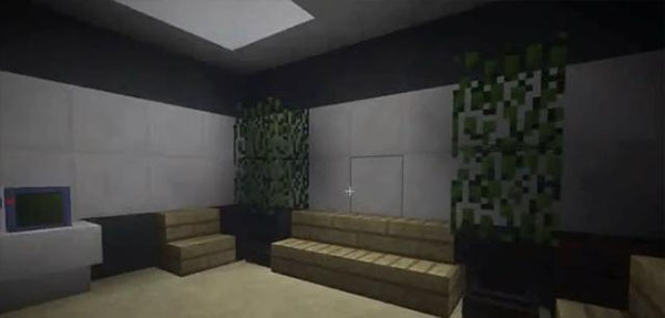 另一侧需为口袋妖怪玩家设置一台电脑;再用铁砧与橡树树叶进行绿化点缀,当然还需配备凳子,可使用桦木楼梯制作。
