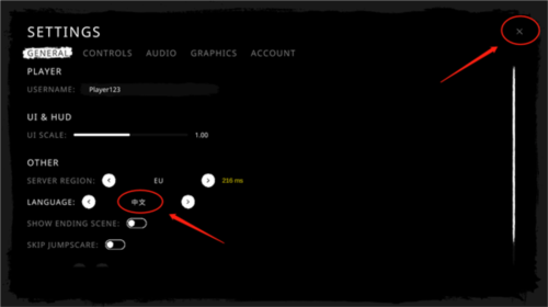 3、选择【中文】后,点击右上角的【X】关闭设置界面。