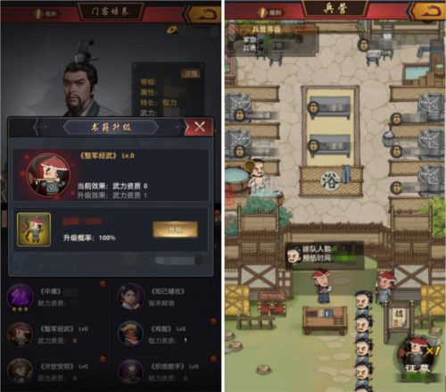 关卡达到第5关后解锁;消耗征募次数招募新兵并进行训练,将其培养为兵勇后可获得军饷与士兵资源;兵勇可用于提升门客的特殊书籍。
