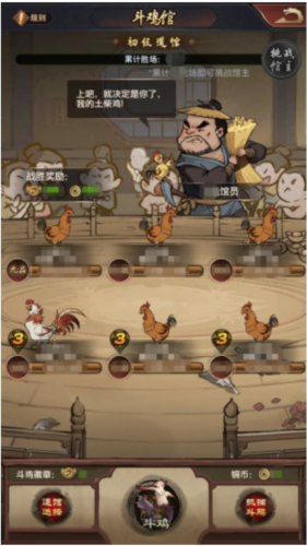 关卡达到第10关后解锁;通过消耗饲料诱捕斗鸡,品级越高战斗力越强;集齐3只斗鸡后可进行3v3比赛,获胜获得斗鸡徽章,用于升级专属书籍。