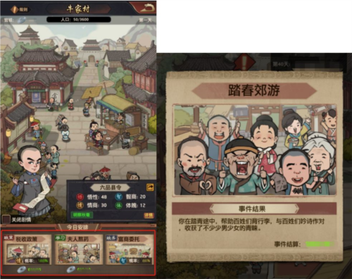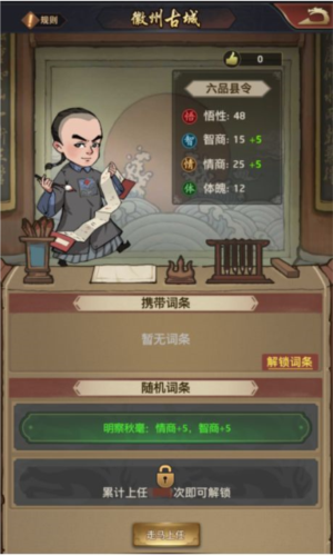 关卡达到25关后解锁;扮演县令处理政务,通过决策影响人口、官银及自身四维属性;卸任时根据表现获得县令经验与人口奖励,人口用于升级门客政治类书籍。