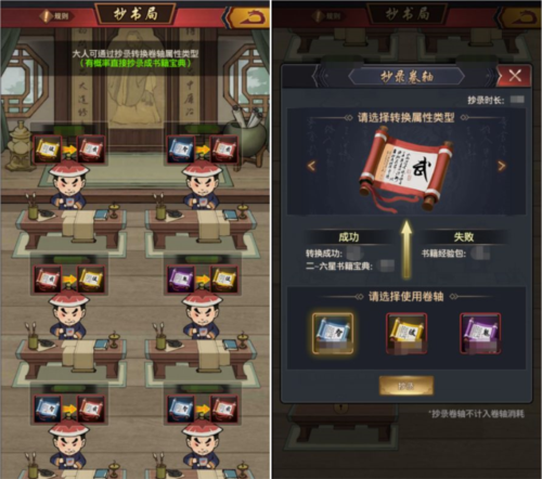 官品达到从五品后解锁;可将任意属性卷轴放入,经过抄录时间后,有概率转化为指定属性卷轴、书籍宝典或书籍经验包,方便门客均衡发展。