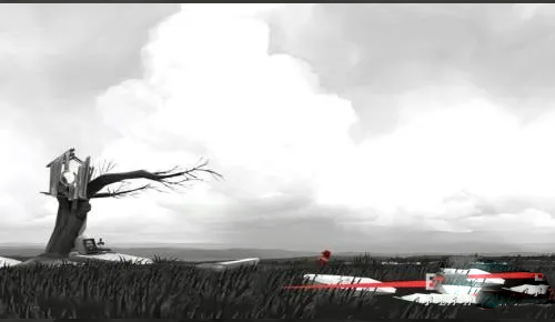 2、黑白交织的天空与大地,鲜红的主角,残破的建筑,零星的动物,以及沉船、废桥、孤灯塔等工业遗存,都暗示世界曾发生剧变。