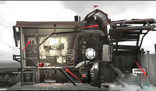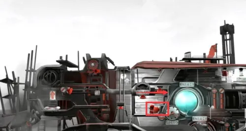 2、在起始房间内,沿箭头方向前进。高亮的橙红色机关是解谜关键,人物基本动作为移动、跳跃与推动,对应机关的操作通常是顶、踩或推。收集到的能量液用于驱动后续的车辆。注意能量液也可用于灭火,称其为燃料可能不够全面。若有收集喜好,可将屋内物品带到外面台阶,一并推下,否则离开后无法返回。