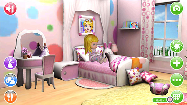 1、拍照功能:每套服装配有专属背景,可让艾娃站在书本或手掌上合影;