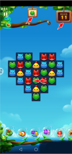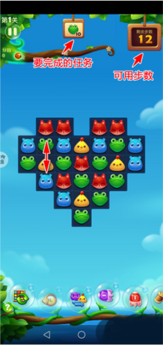 1、关卡开始后,画面正上方会出现任务提示,例如需要消除特定数量的青蛙;右上角则显示本关可用的步数。
